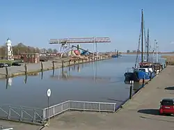 Molenfeuer am Hafen Großensiel, Verladebrücke und Unterfeuer (rechts)