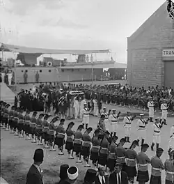 Britische Marinesoldaten tragen den bekränzten Sarg Faisals I. von Bord, 1933