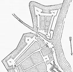 Wie aus der Stadtskizze mit der Situation vor Anlegung der Hafenstraße ersichtlich, lag die alte Berger Pforte im Bereich der heutigen Einmündung der Akademiestraße, damals noch Commissariatsstraße genannt. Die Westseite der Commissariatsstraße war zu dieser Zeit noch nicht bebaut, da dort die Stadtmauer verlief. Erst nach Fertigstellung des Berger Hafens und der Zitadelle 1620 wurden sowohl Hafen-, Schul- wie auch Citadellstraße in der ersten Hälfte des 17. Jahrhunderts angelegt.