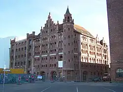 Das sechsgeschossige Backsteingebäude wurde im Jahr 1905 an der südlichen Ecke der Hafenstraße zur Neuen Semlower Straße auf einem Pfahlwerk errichtet.