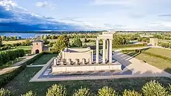 Das Tempelgebäude bildete das Zentrum einer nahezu rechteckigen Anlage, die eine Fläche von 68 × 94 m umfasste und als Tempelbezirk bezeichnet wird. Auch von der Eingrenzung dieser Anlage sind nur noch Fundamente aufgefunden worden, die aus zwei parallel zueinander verlaufenden Reihen bestehen. Die äußere davon reicht deutlich tiefer in die Erde als die innere, hatte also ein größeres Gewicht zu tragen. Daraus lässt sich schlussfolgern, dass das Tempelareal durch eine (vermutlich zweigeschossige) Portikus eingegrenzt wurde, also einen Säulengang, der nach innen hin offen war: Die inneren Fundamente trugen demnach eine Säulenreihe, die äußeren Fundamente dagegen eine massive Mauer, die als Temenos auch den heiligen Bezirk nach außen hin abschirmte. Dadurch entstand dazwischen ein nach innen offener, überdachter Umgang um den Innenhof.