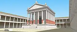 Die Außenmauer dieser Portikus war nach Norden hin durch leicht hervortretende Abschnitte, sogenannte Lisenen, gegliedert. Dort verlief der Decumanus maximus, also die ost-westliche Hauptstraße der Stadt. Im Westen des Tempelareals sind fünf Meter vor der äußeren Portikusmauer, direkt an der dort verlaufenden Nord-Süd-Straße, die Reste von mehreren Fundamentstickungen freigelegt worden, die in einem Abstand von ungefähr 4,50 m zueinander stehen. Daher nimmt die Forschung an, dass sich an dieser Stelle auch nach außen hin eine kleine Säulenreihe befunden hat, in der möglicherweise der Eingang zum Heiligtumsbezirk lag. Ein Anhaltspunkt dafür ist auch, dass man auf den beiden Schmalseiten des Tempelbezirkes keine Indizien für einen dortigen Zugang zum Innenhof gefunden hat.