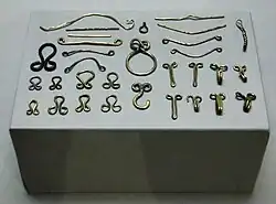 - Die Fibel (von lat. fibula ‚Spange‘), die nach dem Prinzip der Sicherheitsnadel funktioniert.[2]