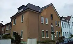 Am Hagelkreuz, Ecke Klotzstraße/Schulstraße errichtete 1938 der Architekt Helmut Hentrich das Jugendheim für die Hitlerjugend. Das Haus der Jugend wurde am 20. April 1939 in der Schulstraße 44 eingeweiht.[36] Die Jugendherberge des Deutschen Jugendherbergswerks (DJH), die in dem Gebäude anschließend Übernachtungen für wandernde Jugendliche anbot, musste Mitte der 1950er Jahre ihren Betrieb einstellen. Zwei Jahre lang dienten die Räume Flüchtlingen als Unterkunft. Erst im Juli 1956 konnte das DJH das Haus nach den nötigen Instandsetzungsarbeiten wieder für Jugendliche öffnen. Bis Anfang Dezember 1956 wurden 880 Übernachtungen verzeichnet. Im Oktober 1958 übernahm die Stadt Hilden das Gebäude als Jugendheim.[50][51] Heute werden im ehemaligen Jugendheim 50 Kinder von 3 bis 6 Jahren in der Städtischen Kindertageseinrichtung „Mäusenest“ betreut.[52]