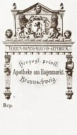 - ↑ Rolf Ahlers: Die Hagenmarkt-Apotheke – seit 340 Jahren. In: Braunschweigische Heimat. Band 103, Nr. 1, 2017, S. 8 (tu-braunschweig.de [PDF]).