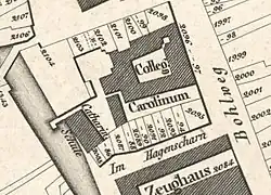 Die Karte von Johann Karl Mare aus dem Jahr 1829 zeigt, dass das Gebäude direkt an die Catharinen-Schule anschloss. Es wurde 1884 abgerissen und der Schmuckbalken dem Städtischen Museum übergeben.[4] In dem Bereich befand sich von 1745 bis 1877 auch das Schulgebäude des Collegium Carolinum (Assekuranznummern 2096–2097). Insgesamt gab es dort zehn Häuser. Den Abschluss zum Bohlweg bildete das Eckhaus (Nr. 2095).