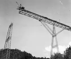 Die Brücke wurde von der Steiner-Seite aus im Freivorbau erstellt. Der Materialbereitstellungsplatz befand sich beim Restaurant Schäfli im Störgel.[6] Die Schlossereiwerkstatt Zwicker aus St. Gallen fertigte und montierte über 700 m Geländer.[4] Obwohl der seinerzeit spektakuläre Bau für die Arbeiter ziemlich gefährlich war, ereignete sich nur ein Unfall, welcher glimpflich verlief. Der damals 20 Jahre alte Maurerlehrling Ernst Buob stürzte 36 m in die Tiefe, wurde von einer Tanne abgebremst und überlebte.[2]