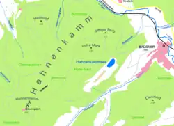 Der ungefähr einen Hektar[1] große Hahnenkammsee liegt westlich des Ortes Brücken auf etwa 250 m ü. NHN an dem Hohe Mark genannten nördlichen Hahnenkammrücken.[1] Der Bergsee überdeckt die Sohle des ehemaligen Steinbruches, der sich seit dem Jahr 2008 mit Regenwasser füllt. Das Betreten des Geländes ist seitdem verboten.