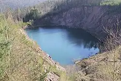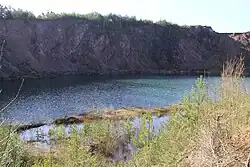 | Der Hahnenkammsee von Nordosten. Im hinteren Bereich der mit Erdaushub verfüllte Teil. | ||