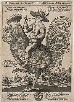 Für das Hochmittelalter ist eine Verwendung des Wortes „Kapaun“ im Sinne von Ehebrecher und auch Kuppler belegt. Vom 17. Jahrhundert an waren Hahnrei-Spottbilder, auch in der Form von Medaillen,[2] besonders beliebt, die – etymologisch unrichtig – einen „Hahnen-Reiter“ zeigen. Nach Hermann Dunger setzt sich die Bezeichnung Hahnrei jedoch aus Hahn und Reh, einem gehörnten Tier eben, zusammen;[3] daneben gibt es eine Reihe anderer Deutungen.[4]