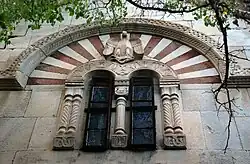 Außer am Tambour sind an den Außenwänden im Unterschied zu anderen georgischen Kirchen keine Blendarkaden vorhanden, dafür wurden Bogenlaibungen und figürliche Schmuckmotive plastisch gestaltet. Über dem Doppelfenster in der Mitte des südlichen Kreuzarms hält ein plastisch aus der Wand tretender Adler einen kleinen und nur flach abgebildeten Stier in seinen Fängen (Königssymbol).