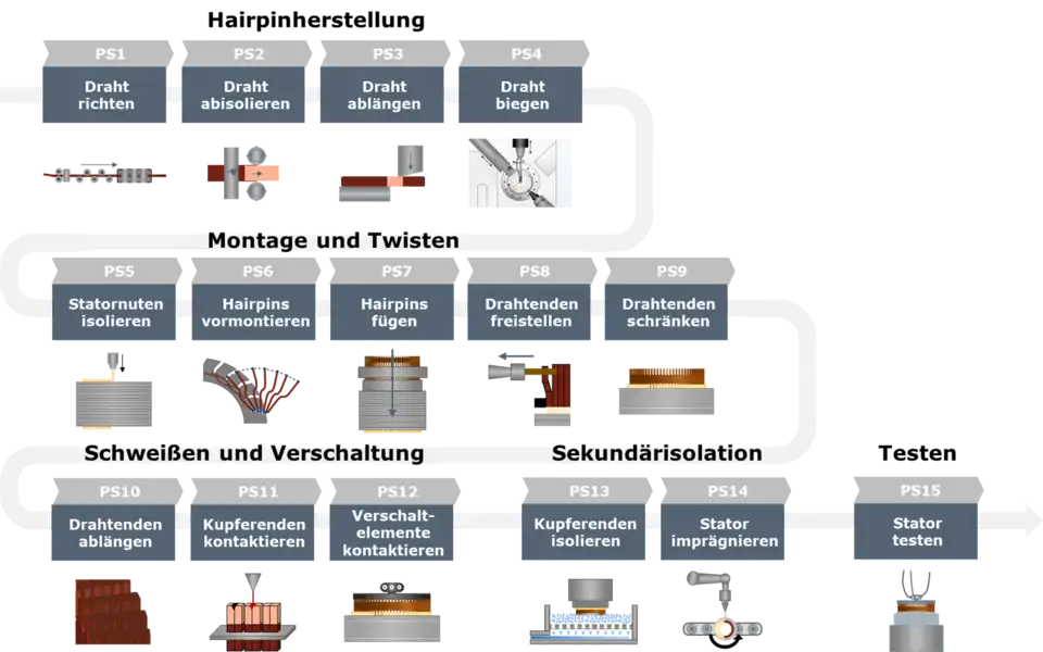 Die Herstellung eines Hairpin-Stators lässt sich in 5 Abschnitte und 15 Produktionsschritte (PS) unterteilen: