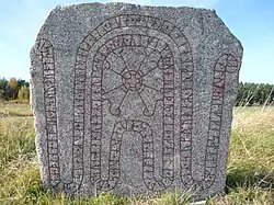 Er ist ein wenig verzierter, im altertümlichen Rak-Stil gehaltener Stein mit einem langen doppelten Schlangenband und einem zentralen Kreuz. Er stammt von der gleichen Adelsfamilie die die Ramsundritzung veranlasste und den Runenstein von Kjula ås aufstellen ließ. Er ist einer von wenigen Steinen, die bestätigen, dass die Wikinger sich selbst Wikinger nannten. Die Inschrift lautet: