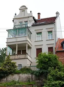 Die Villa entstand im Jahr 1904 im Stil des Historismus, wobei die Fassade von Neorenaissance-Formen geprägt wird. Bemerkenswert sind am Gebäude vorhandene Jugendstil-Bleiverglasungen die sowohl figürliche Motive als auch Ornamente zeigen. Über der seitlichen Eingangstür befindet sich neben der Angabe des Baujahres auch ein Baumeisterzeichen.
