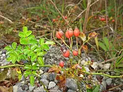 Die bei Reife purpur-schwarz-braune oder rote Hagebutte ist bei einer Länge von 5 bis 10 Millimetern sowie einem Durchmesser von 6 bis 18 Millimetern mehr oder weniger kugelig, stachelig und spärlich drüsig-flaumig behaart.[2] Die ein bis elf Achänen sind dunkel-lohfarben und 4 bis 4,5 Millimeter lang sowie 2 bis 2,5 Millimeter breit.[1]
