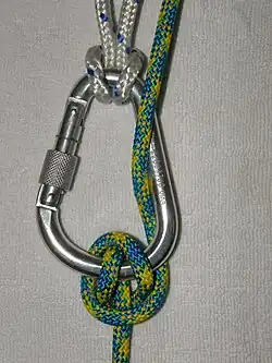 Den Karabiner von unten durch das lose Seilende und das Auge einklinken -