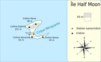 Die sichel(„halbmond“)-förmige Insel stellt den Kraterrand eines einstigen Vulkans dar. Während der südliche und nördliche Bereich der Insel bergig sind und sich bis zu einer Höhe von 101 m erheben, erstreckt sich der mittlere Teil nur wenige Meter über Meereshöhe. In diesem Bereich, an der Meguante Cove, betreibt Argentinien seit 1955 eine antarktische Forschungsbasis, die Cámara-Station.
