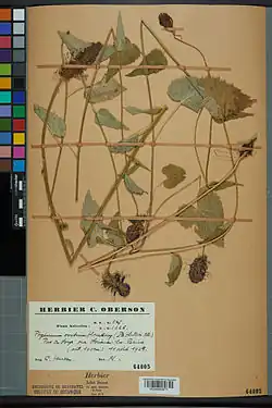 Die Grundblätter sind lang gestielt und herzförmig. Die Blattspreite sind etwa so lang wie breit und grob doppelt gezähnt. Die wechselständigen Stängelblätter sind etwas kleiner, wobei die obersten lanzettlich sind mit mehr oder weniger voll entwickelter Blattspreite. Die mittleren Stängelblätter sind an der Basis herzförmig oder abgerundet.[1]