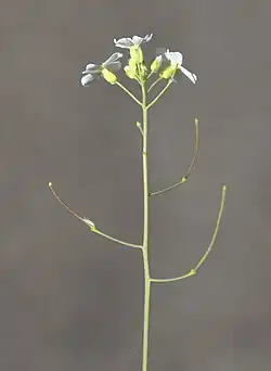 Der Blütenstand ist sehr locker, weit auseinandergezogen und macht gut die Hälfte der Länge der ganzen Pflanze aus. Die Kronblätter sind weiß oder lila und 4 bis 6 Millimeter lang und mit einem langen Nagel versehen. Die Kelchblätter sind etwa ein Drittel so lang wie die Kronblätter. Die Schoten sind unter 1 Millimeter breit und schwach perlschnurartig gegliedert. Sie sind bis 30 Millimeter lang und sind 10–13 Millimeter lang gestielt. Sie stehen vom Stängel ab in einem Winkel von etwa 60 Grad. Die Frucht hat eine schmale Scheidewand (viel schmäler als die Frucht breit ist). Die Frucht ist rechtwinklig zur Scheidewand abgeflacht.[1]