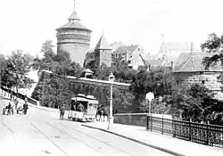 1881 wurde als eine der ersten Nürnberger Pferde-Straßenbahnlinien die Strecke vom Laufertor über das Rathaus zum Plärrer eröffnet. Die Gleise führten durch das Hallertor, das erst dafür errichtet wurde, und über die Hallertorbrücke. Um neben den Straßenbahngleisen Platz für die Fußgänger zu schaffen, wurden die Fußwege auf seitlich angebaute Stahlkonsolen verlegt.[1] 1898 wurde die Straßenbahnstrecke elektrifiziert und die Neubaustrecke zum Westfriedhof eröffnet.[2] 1903 folgte die Linie über das Tiergärtnertor zum Maxtor.[3]
