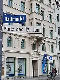 Beim Volksaufstand in der DDR war die Stadt Halle eines der Zentren der Unruhen. Mehrere tausend Bürger, die sich auf dem Hallmarkt versammelt hatten, um für freie Wahlen und gerechtere Löhne zu demonstrieren, wurden unter Einsatz sowjetischer Panzer auseinandergetrieben. Zur Erinnerung an diesen Tag trägt der Hallmarkt seit 2003 den Namenszusatz „Platz des 17. Juni“.[1]