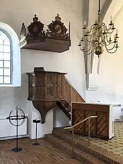 Die Kanzel wurde 1572 angefertigt und ist im vorderen Teil der Nordwand aufgehängt. Die acht Felder zeigen in der oberen Reihe einen geflügelten Menschen, einen Löwen, einen Stier und einen Adler, die die Evangelisten Matthäus, Markus, Lukas und Johannes symbolisieren. In der unteren Reihe sind der Sündenfall, der gekreuzigte Christus, das Adelswappen der Familie Gyldenstierne und die Eherne Schlange abgebildet. Sie war ursprünglich farbig gefasst. Der mit fünf Schilden geschmückte Schalldeckel stammt vermutlich von 1727.