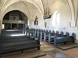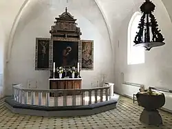Eine Kreuzigungsgruppe an der Nordwand aus katholischer Zeit umfasst ein hölzernes Kruzifix, sowie ebenfalls hölzerne Figuren von Maria und Johannes. Die dreiteilige Altartafel von 1598 zeigt auf den Seitentafeln Darstellungen des 18. Jahrhunderts von Kreuzigung und Auferstehung. Die Haupttafel in der Mitte stammt von 1899 und zeigt ein Gemälde des Christus in Gethsemane von Anton Dorph. Der Altaraufsatz im Renaissancestil stammt aus dem Jahr 1620.