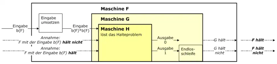 Falls das Halteproblem entscheidbar ist, gibt es eine Turingmaschine , die für jede Turingmaschine mit jeder Eingabe entscheidet, ob irgendwann anhält oder endlos weiterläuft. Die Eingabe für besteht dabei jeweils aus einer codierten Beschreibung der Maschine und deren Eingabe .