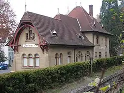 Der ein- und zweigeschossige Bau aus Sandsteinquadern mit Walmdächern (und Satteldach auf dem östlichen Gebäudeteil) ist mit Elementen der Neugotik und des romantisierenden Landhausstils ausgestattet. An der Straßenseite zeigt sich die Fassade dreiteilig mit mehreren Kreuzstockfenstern und zwei mit Säulen getragene Rundbögen (Eingangsbereich), mit darüber liegender Plattform samt Balustrade und steinerner Adlerfigur. An der Westseite befindet sich ein Eck-Balkonerker mit Rundbogen.