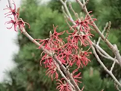 | 'Carmine Red' | Blüten groß, Kelch innen weinrot, Kronblätter 2 cm lang, schmal, gefaltet und gedreht, blass bronze, an den Spitzen mehr kupfrig, Basis rot, ausgesprochen karminrot in der Knospe | Blätter eirund bis kreisrund, bis 13 × 13 cm groß, im Herbst gelb | Mittelgroßer, breiter Strauch | Im Hillier Garten entstanden, spätblühend, März, Schlechter Blüher | |||