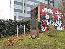 1982, Denkmal des Künstlers Waldemar Otto, die Sockelreliefs stellen den zeitgenössischen Bezug her: ein Text gemahnt an die Bücherverbrennung, der zweite an den Denkmalsturz. (Wegweiser zu den Gedenkstätten, Nr. 58) |