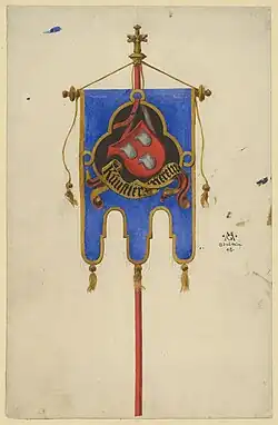 1852 überreichten aus Dankbarkeit über die Stiftung des Altarbildes Hamburger Frauen dem Künstlerverein ein großes Banner. Das Banner war eine Arbeit und ein Geschenk von Hamburger Frauen. Hermann Wilhelm Soltau hatte für die Frauen das Banner entworfen und diese haben es dann genäht und bestickt. Auf der Vorderseite waren zwei gegeneinandergelehnte Schilde abgebildet, von denen der eine das Hamburger Wappen und der andere das Künstlerwappen[39] trug. Umgeben waren die beiden Schilde von einem Spruchband mit der Aufschrift Die Frauen Hamburgs dem Künstlervereine und den Jahreszahlen 1832 und 1852, dem Gründungsjahr des Vereins und das Jahr der Überreichung des Banners. Auf der Rückseite des Banners war der Evangelist Lukas abgebildet, der Schutzpatron der Maler. Auf beiden Seiten des Banners war jeweils am Rand ein Frucht- und Blumengewinde abgebildet, das das Innere der Bannerseite umgab.[40]
