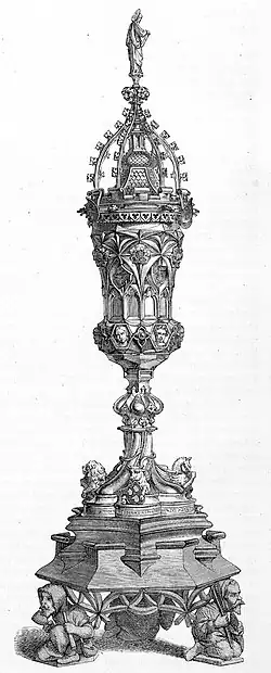 Verschollen bleibt jedoch der in Bronze gegossene Untersatz des Pokals, dessen drei Zwerge, die drei Künste Malerei, Bildhauerei und Architektur symbolisieren. Ernst Gottfried Vivié entwarf die Zwerge und formte ihre Modelle. Der Untersatz war bei der Versteigerung nicht dabei und fehlte auch auf dem Foto von ca. 1932. Er wurde jedoch im März 1858 im Deutschen Kunstblatt in einer Illustration des Pokals mit abgebildet. Er und der Pokal wurden im Kunstblatt genau beschrieben. Ebenfalls fehlt eine Medaille, die an dem Pokal hing. Sie wurde wie die schon genannten Medaillen von Hermann Wilhelm Soltau entworfen und von Heinrich Lorenz graviert. Die Motive der beiden Seiten der Medaille scheinen die gleichen zu sein, wie die der schon genannten Medaille.[52] In Günther Genslers Gruppenporträt Hamburger Künstler von 1859 ist er nicht mit abgebildet, jedoch stellt die Szenerie einen Zeitpunkt vor der Fertigstellung des Pokals dar, in der die Künstler über die Endfassung des Pokals beraten, der auf den Tisch steht und von Martin Genslers rechter Hand gehalten wird. Otto Spekter hält ein weiteres Teil in seiner linken Hand, das dem unteren Teil des Pokals auf dem Tisch ähnlich ist und scheinbar ausgetauscht werden kann.