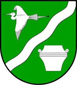Blasonierung: „In Grün ein schräglinker silberner Wellenbalken, begleitet oben von einem fliegenden silbernen Reiher, unten von einer silbernen Urne.“[4]