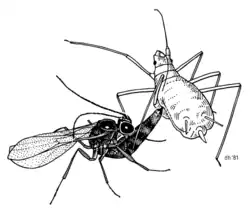 Aphidius sp., eine Erbsenblattlaus attackierend