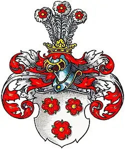 Blasonierung: In Silber drei (2:1) rote Rosen. Auf dem gekrönten Helm mit rot-silbernen Helmdecken drei silberne Straußenfedern, jede mit einer roten Rose belegt.[3]