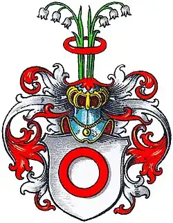 Blasonierung: In Silber ein roter Ring. Auf dem Helm mit rot-silbernen Helmdecken zwei grüne Stauden mit je drei silbernen Blumen (Maiglöckchen) von dem Ring zusammengehalten.[1]