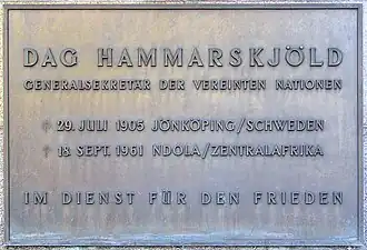 - ↑ Gedenktafel für Dag Hammarskjöld. 14. August 2014, abgerufen am 18. April 2020.