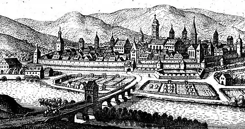 1524 führte Johannes Kempach (latinisiert: Johannes Compagus) in Hammelburg die Reformation ein, als er im lutherischen Sinne zu predigen begann.[10] Fortan war die Stadt konfessionell gespalten. 1530 wurde in Hammelburg der Hammelburger Vertrag zwischen dem Erzstift Mainz und der Stadt Erfurt abgeschlossen, der das Zusammenleben von Katholiken und Protestanten regelte. 1603 bewirkte Balthasar von Dernbach, der Fürstabt des Hochstifts Fulda, die Rekatholisierung der Stadt. Etwa 100 Lutheraner mussten daraufhin Hammelburg verlassen.[11]