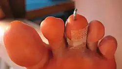Hammerzehen nach der operativen Korrektur; deutlich sind die verkürzten dritten Glieder der drei inneren Zehen erkennbar (Operation nach Hohmann). Bei dieser OP wurde auch der Hallux valgus korrigiert. -
