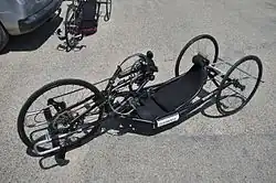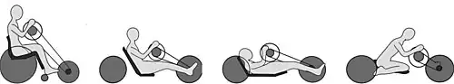 - Handbikes mit liegender Position werden vor allem als Sportgeräte genutzt und ermöglichen eine Verwendung auch bei geringer Rumpfkraft. Die Beine liegen seitlich des Vorderrads, der Kopf zwischen den Hinterrädern. Durch die kompakte Form ist der Luftwiderstand besonders gering, was vor allem in der Ebene hohe Geschwindigkeiten ermöglicht.
