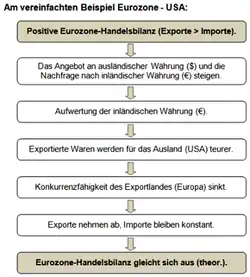 Angenommen werden zwei Länder oder Wirtschaftsräume, welche unterschiedliche Währungen aufweisen, wie etwa USA und Europa. Weist die Handelsbilanz eines Landes (Euroland) ein Defizit auf, bedeutet dies, dass es dieses Defizit bei seinem Handelspartner (USA) zwischenfinanzieren muss. Dadurch entsteht, neben Zinsverpflichtungen für dieses Land, ein erhöhter Bedarf an ausländischer Währung (Dollar) und ein Überangebot der inländischen Währung (Euro). Eine Möglichkeit für Europa sein HB-Defizit auszugleichen ist die Abwertung des Euros. Ein Anstieg des nominalen Wechselkurses (Preisnotierung) hat zur Folge, dass der Preis für Güter aus den USA in Einheiten europäischer Güter steigt, im Umkehrschluss, Güter aus Europa für die USA günstiger werden. Verfügt der Markt nun über eine hohe Nachfrageelastizität, werden sich die Gütermengen kurzfristig mit der Veränderung des Wechselkurses korrigieren (Robinson-Bedingung). Infolgedessen werden die Exporte aus dem Euroraum steigen, da diese für das Ausland günstiger geworden sind, und die Importe aufgrund des relativen Preisanstiegs sinken. Ist der Umfang des Exportanstiegs groß und der Rückgang der Importe stark genug, um die gestiegenen Importpreise zu kompensieren, wird sich die Handelsbilanz im Zuge der Euroabwertung verbessern (Marshall-Lerner-Bedingung).