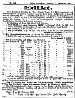 Versteigerungsedikt für die Hannesmühle in den Bozner Nachrichten, 1906