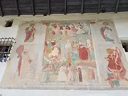 Kunsthistorisch besonders interessant sind die Fresken neben der Eingangstür, die aus der Zeit um 1520 stammen. Das linke, kleinere Fresko zeigt die Mutter Gottes in einem Kielbogen. Das rechte, größere Wandgemälde bringt im Zentrum den gekreuzigten Christus. Darüber ist Gottvater über dem Himmelstor, umgeben von Engeln, dargestellt. Zu beiden Seiten des Kreuzes erkennt man links Maria, rechts Eva, sowie links die allegorische Figur der Ecclesia und rechts der Synagoge. Direkt unterhalb der Maria sind die Symbole der Evangelisten und ein Spruchband zu erkennen. In der untersten Ebene, unterhalb des Kreuzes, sind Engel mit Lanzen in Händen dabei die Vorhölle mit den armen Seelen zu erstürmen. Das mehrteilige Bild wird zudem von vier großen Heiligenbildern umgeben, die auf der linken Seite oben den Apostel Johannes, unten den heiligen Florian und auf der rechten Seite oben den Apostel Bartholomäus und unten den heiligen Georg zeigt.