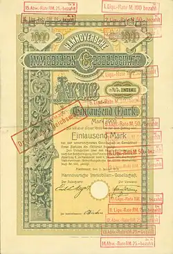- ↑ a b c d e f Jörg Benecke, Michael Weingarten: Details zum Wertpapier ... Hannoversche Immobilien-Gesellschaft auf der Seite der Firma Benecke & Rehse, Wertpapierantiquariat der Aktien-Gesellschaft für Historische Wertpapiere [ohne Datum], zuletzt abgerufen am 17. April 2020