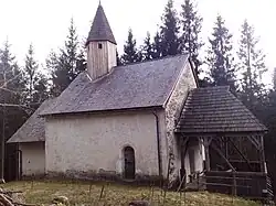 Die 1184 (?) bzw. 1208 erstmals erwähnte Kirche ist ein romanischer Bau mit einem sechsseitigen Dachreiter, einem eingezogenen Chor mit geradem Chorschluss. Die hölzerne Vorlaube ist mit 1850 bezeichnet. An der südlichen Chorwand befindet sich ein Christophorusfresko aus der ersten Hälfte des 16. Jahrhunderts.