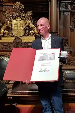 12-Euro-Mindestlohnkämpfer Olaf Könemann, ver.di, mit Hans-Böckler-Medaille, am 26. April 2022, im Hamburger Rathaus