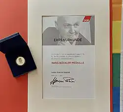 Zur Erinnerung an das Lebenswerk von Hans Böckler, der der erste Vorsitzende des Deutschen Gewerkschaftsbundes (DGB) nach 1945 war, wird vom DGB und seinen Einzelgewerkschaften die Hans-Böckler-Medaille vergeben. Sie ist die höchste Auszeichnung der Gewerkschaften in Deutschland. Mit ihrer Verleihung werden besondere Verdienste im gewerkschaftlichen Bereich, vor allem ehrenamtliches Engagement, gewürdigt. Die Auszeichnung wird auf Beschluss des Geschäftsführenden Bundesvorstandes des DGB vergeben. Anträge erfolgen in der Regel über die Vorstände der Mitgliedsgewerkschaften oder die DGB-Bezirksvorstände.[1]
