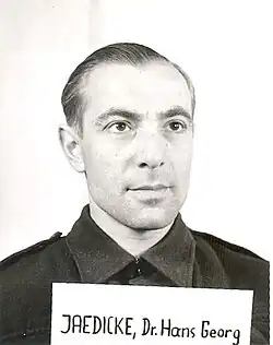 Nach dem Zweiten Weltkrieg wurde Jaedicke bis 1948 von den Briten interniert. Für den ersten Nürnberger Prozess (NMT-1, 'Ärzteprozess', Vereinigte Staaten vs. Karl Brandt et al.) legte er als Zeuge der Verteidigung für Karl Gebhardt ein Affidavit vor,[1][2][3] in welchem er auch seinen eigenen beruflichen Lebensweg bis 1945 erläutert.