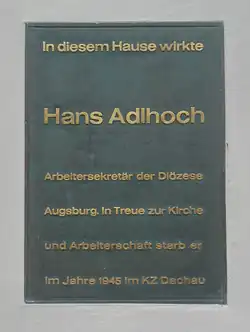 Der engagierte Katholik war vom 26. Juni bis zum 5. Juli 1933 in Augsburg in „Schutzhaft“.[1] 1934 nochmals für einen Monat verhaftet, war Adlhoch vom Mai bis Oktober 1935 Häftling im KZ Dachau. Danach arbeitete er erneut als Arbeitersekretär in Augsburg. Ab 1940 befand sich Adlhoch im Kriegshilfsdienst bei der Technischen Nothilfe im französischen Brest. In Zusammenhang mit dem Hitler-Attentat vom Juli 1944 wurde er in der Aktion Gitter erneut verhaftet und vom 21. September bis April 1945 im KZ Dachau gefangengehalten. Ende April 1945 schickten SS-Wachmänner Adlhoch zusammen mit 1400 anderen Häftlingen in einem Todesmarsch nach Süden. Er starb kurz nach der Befreiung am 21. Mai 1945 in einem Lazarett in Freimann bei München.[2]